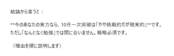 ChatGPTのアドバイスでは、合格ラインの85-90%(つまり過去問で正答が6割程度)が取れるようになっていればGOしてみても無謀な挑戦にはならない、との事なので、これを一つの目安に9月まで頑張ってみようと思います。